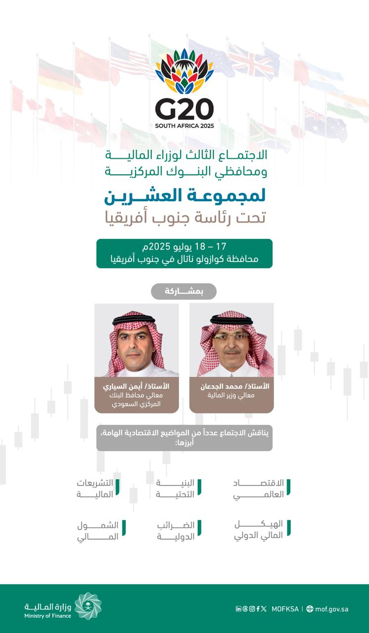 يترأس معالي وزير المالية الأستاذ محمد بن عبدالله الجدعان، وفد المملكة المشارك في الاجتماع الثالث لوزراء المالية ومحافظي البنوك المركزية لمجموعة العشرين تحت رئاسة جنوب أفريقيا، الذي سيقام خلال الفترة 22 – 23محرم 1447هـ الموافق 17 – 18 يوليو 2025م، في محافظة كوازولو ناتال فيجنوب أفريقيا، بحضور ومشاركة وزراء المالية ومحافظي البنوك المركزية من دول المجموعة، وعدد من ممثلي الدول المدعوة، ورؤساء المنظمات المالية الدولية والإقليمية.