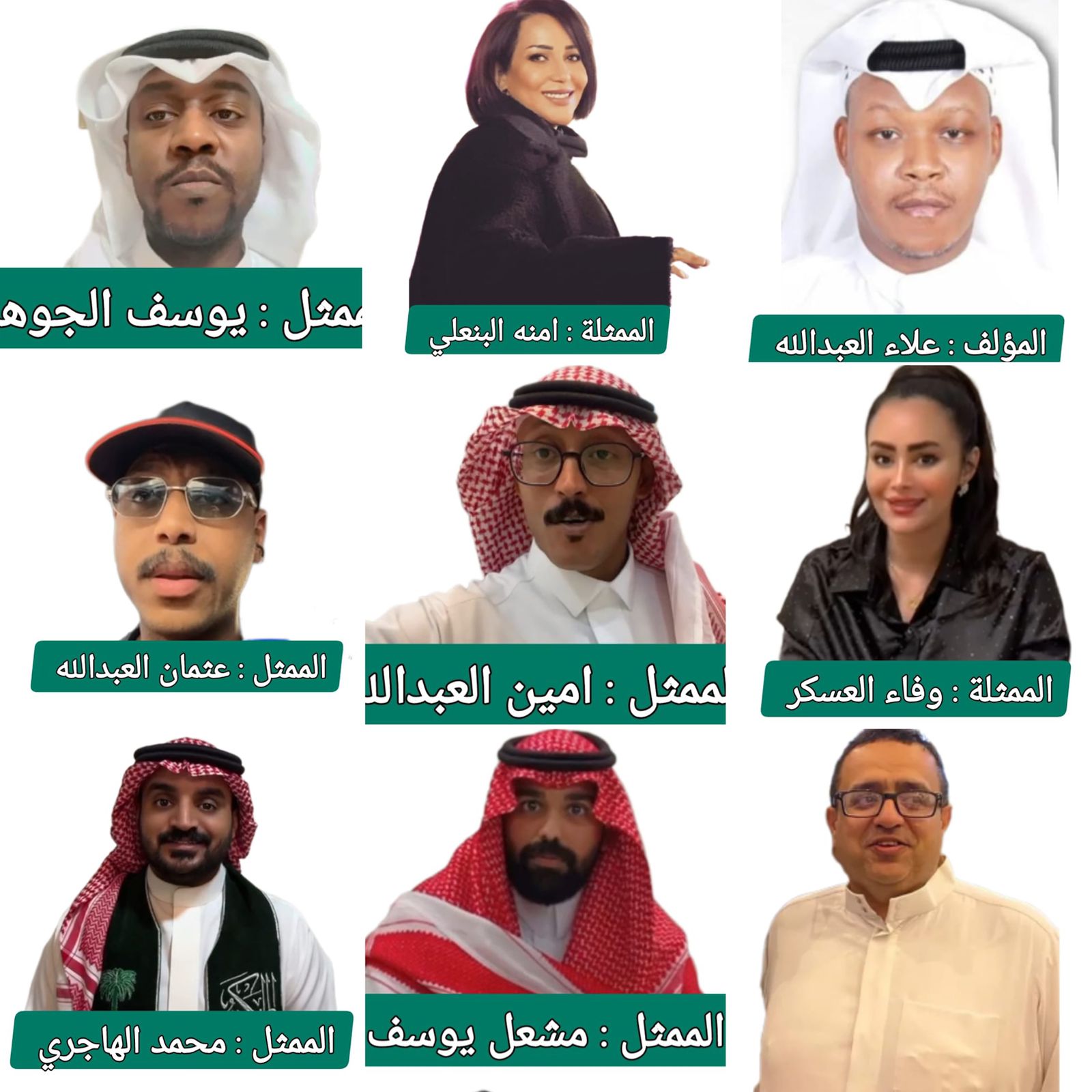 والأبطال الفنانون المشاركون في المسرحية – يوسف الجوهر _ امنه البنعلي _ محمد الهاجري _ وفاء العسكر – امين العبدالله _مشعل يوسف _ جهاد السادة _ عثمان العبدالله .