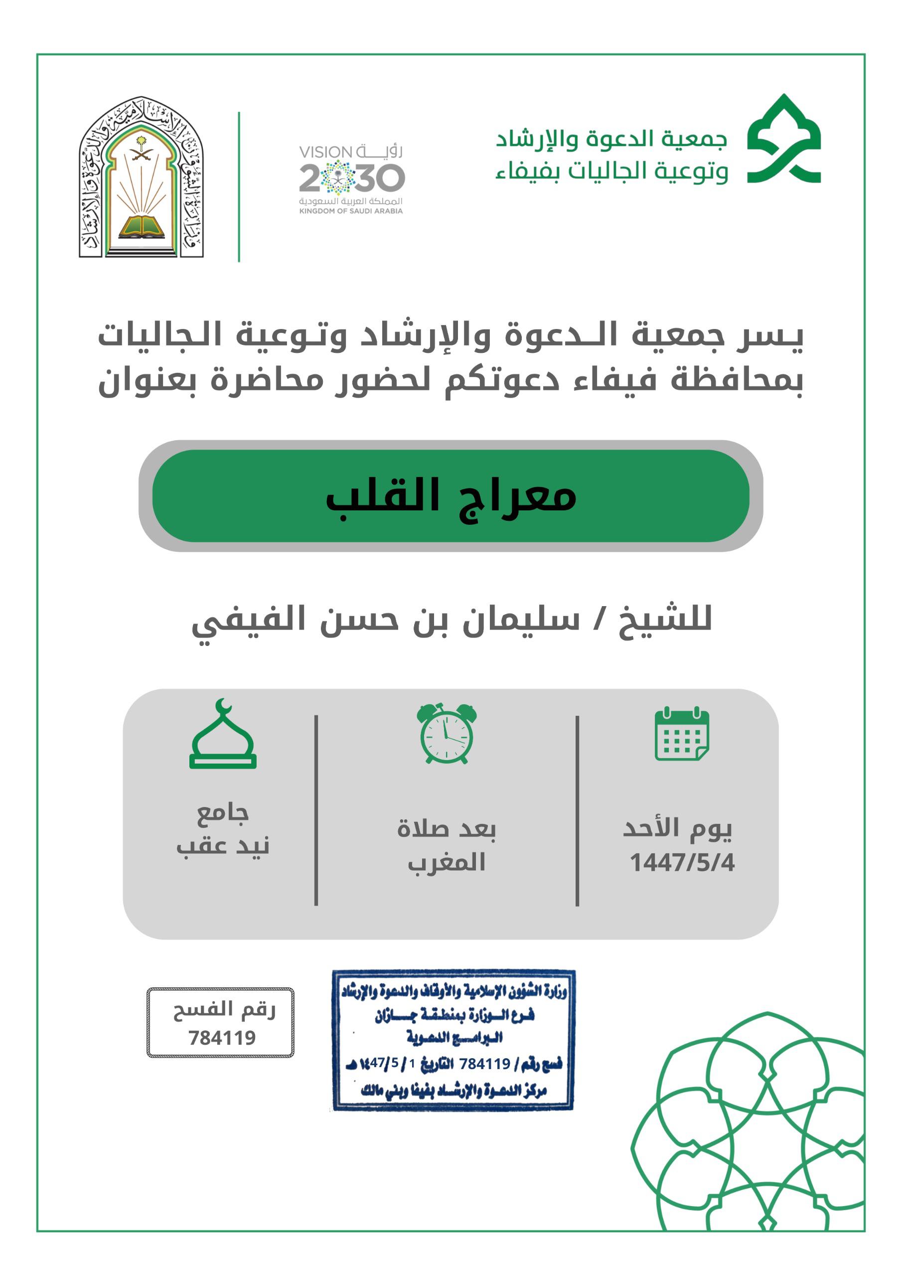 ففي محافظة فيفاء، تُقام محاضرة بعنوان معراج القلب في جامع نيد عقب بعد صلاة المغرب.
