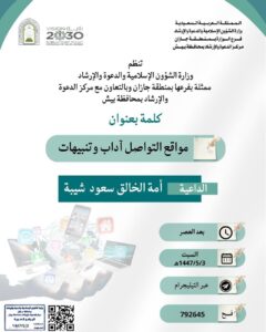 كما أُقيمت في محافظة بيش كلمة دعوية بعنوان مواقع التواصل آداب وتنبيهات عبر البث المباشر بعد صلاة العصر.