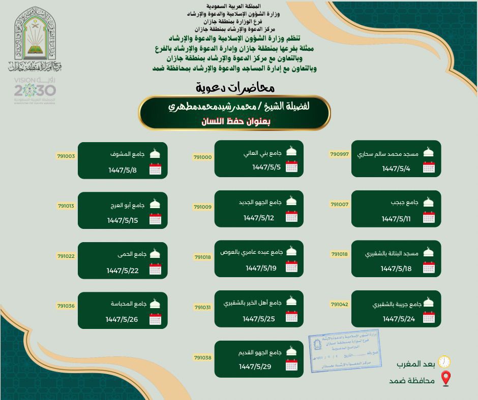 يُطلق فرع وزارة الشؤون الإسلامية والدعوة والإرشاد بمنطقة جازان، وبالتعاون مع جمعية الدعوة والإرشاد وتوعية الجاليات بمحافظة ضمد، سلسلةً من المحاضرات الدعوية تحت عنوان “حفظ اللسان” ، والتي تُقام طيلة شهر جمادى الأولى لعام 1447هـ، بعد صلاة المغرب في عددٍ من الجوامع والمساجد بالمحافظة.