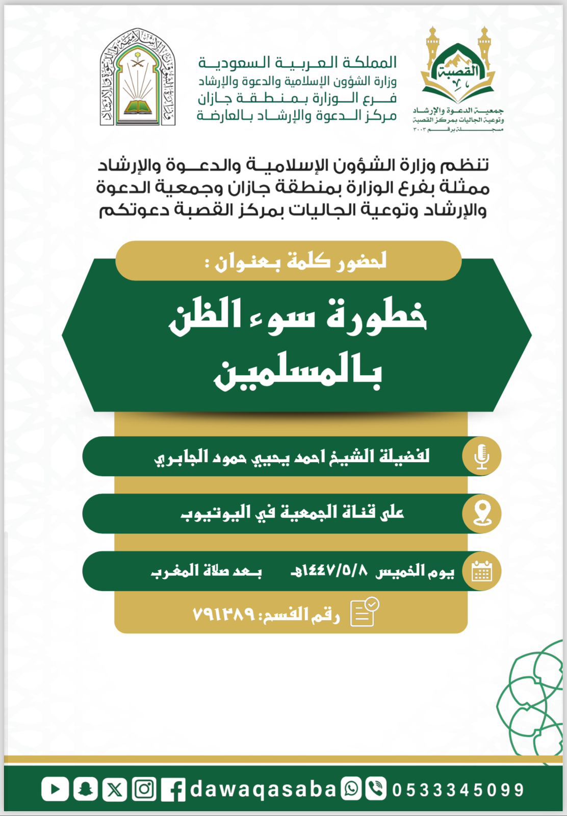سلسلة من الكلمات الدعوية تنظمها الشؤون الإسلامية بجازان بمركز القصبة التابع لمحافظة العارضة