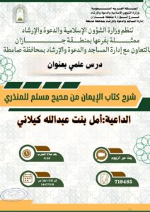 ففي محافظة صامطة، يُقام درسان نسائيان، الأول بعنوان “شرح كتاب الإيمان من صحيح مسلم” ، والثاني بعنوان ” شرح كتاب آداب حملة القرآن” وتُعقد الدروس بعد صلاة المغرب عبر تطبيق الـ”زووم” يومي الثلاثاء والأربعاء من كل أسبوع.