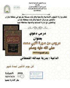 وفي محافظة صبيا، تُقام سلسلة من الدروس الدعوية الأسبوعية بعنوان “دروس من سيرة النبي ﷺ” ، وذلك كل يوم اثنين صباحًا بمقر الإدارة، وتستمر لمدة شهر كامل.