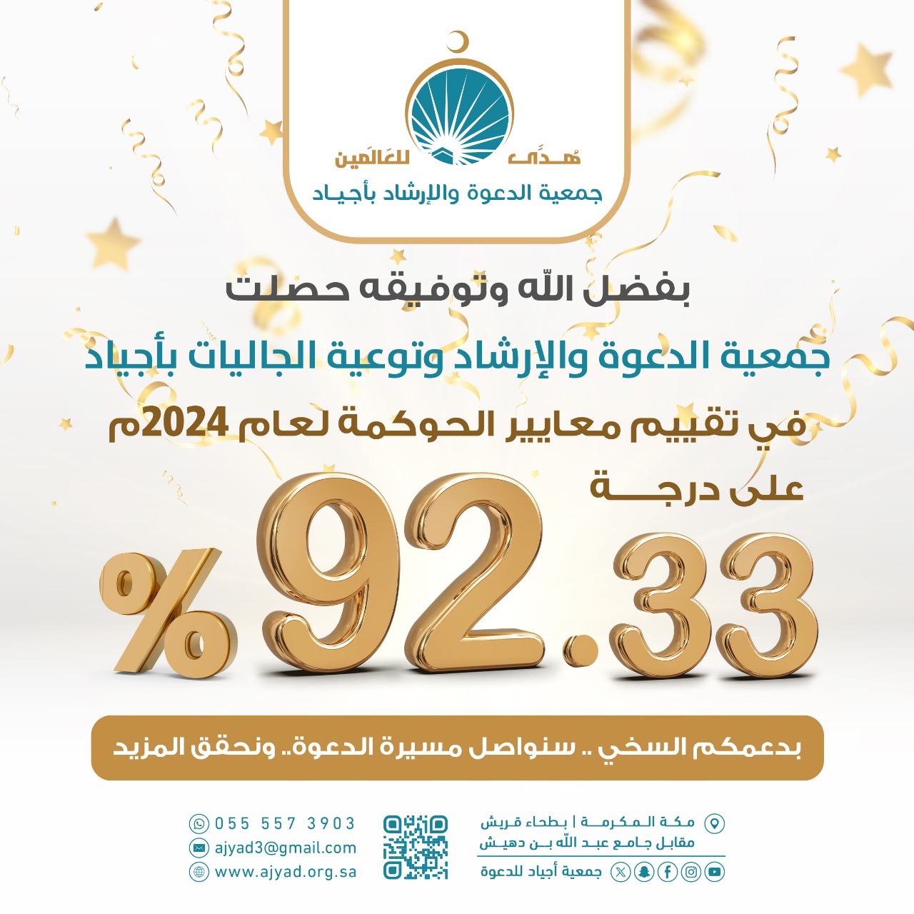 جمعية الدعوة بأجياد تحقق 92.33% في تقييم الحوكمة لعام 2024م