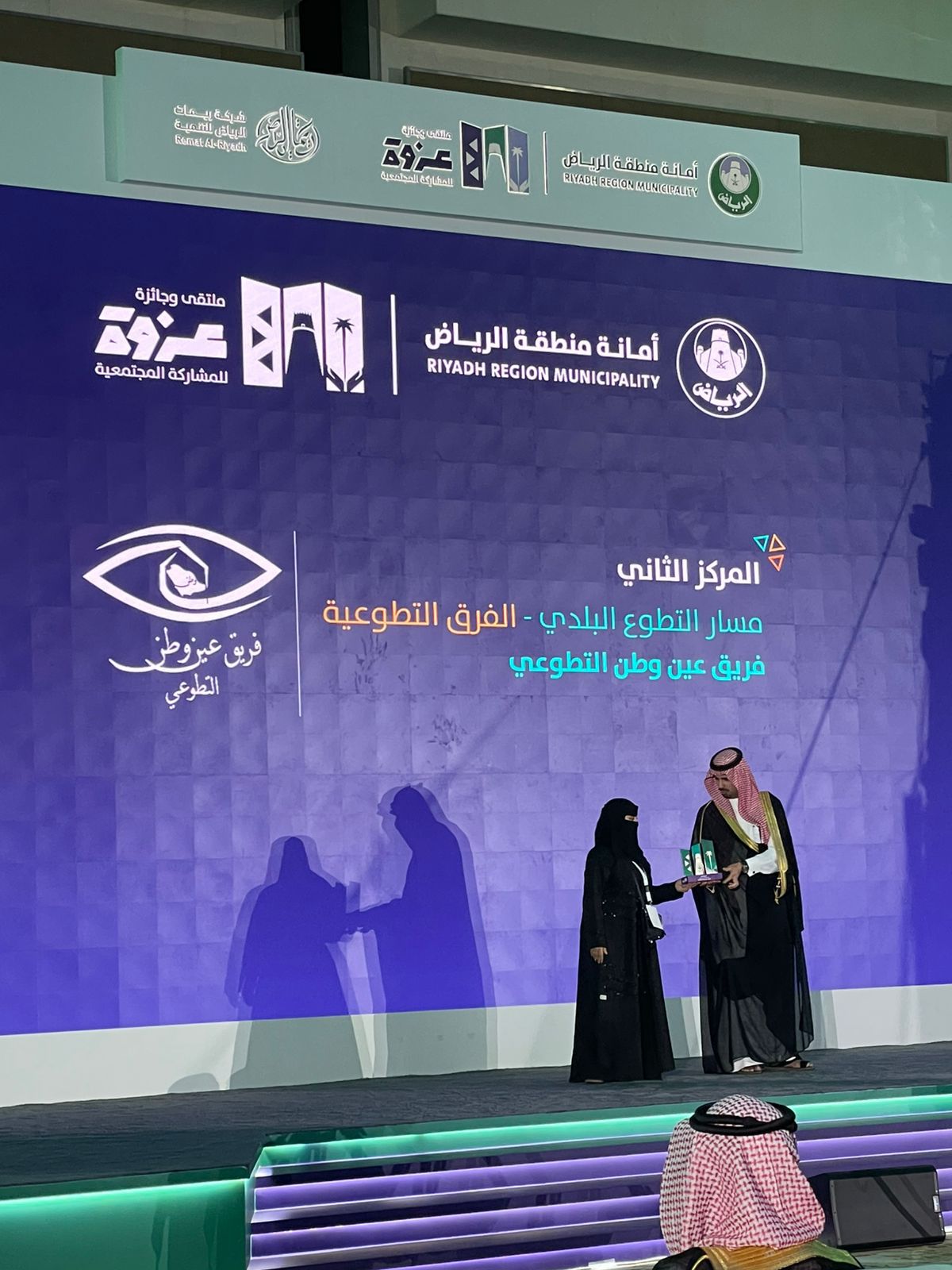 حصد فريق عين وطن التطوعي المركز الثاني في المسار التطوعي ضمن برنامج ملتقى وجائزة “عزوة” للمشاركة المجتمعية، الذي تنظمه أمانة منطقة الرياض، تقديرًا لجهود الفريق المتميزة في خدمة المجتمع وتعزيز العمل التطوعي.