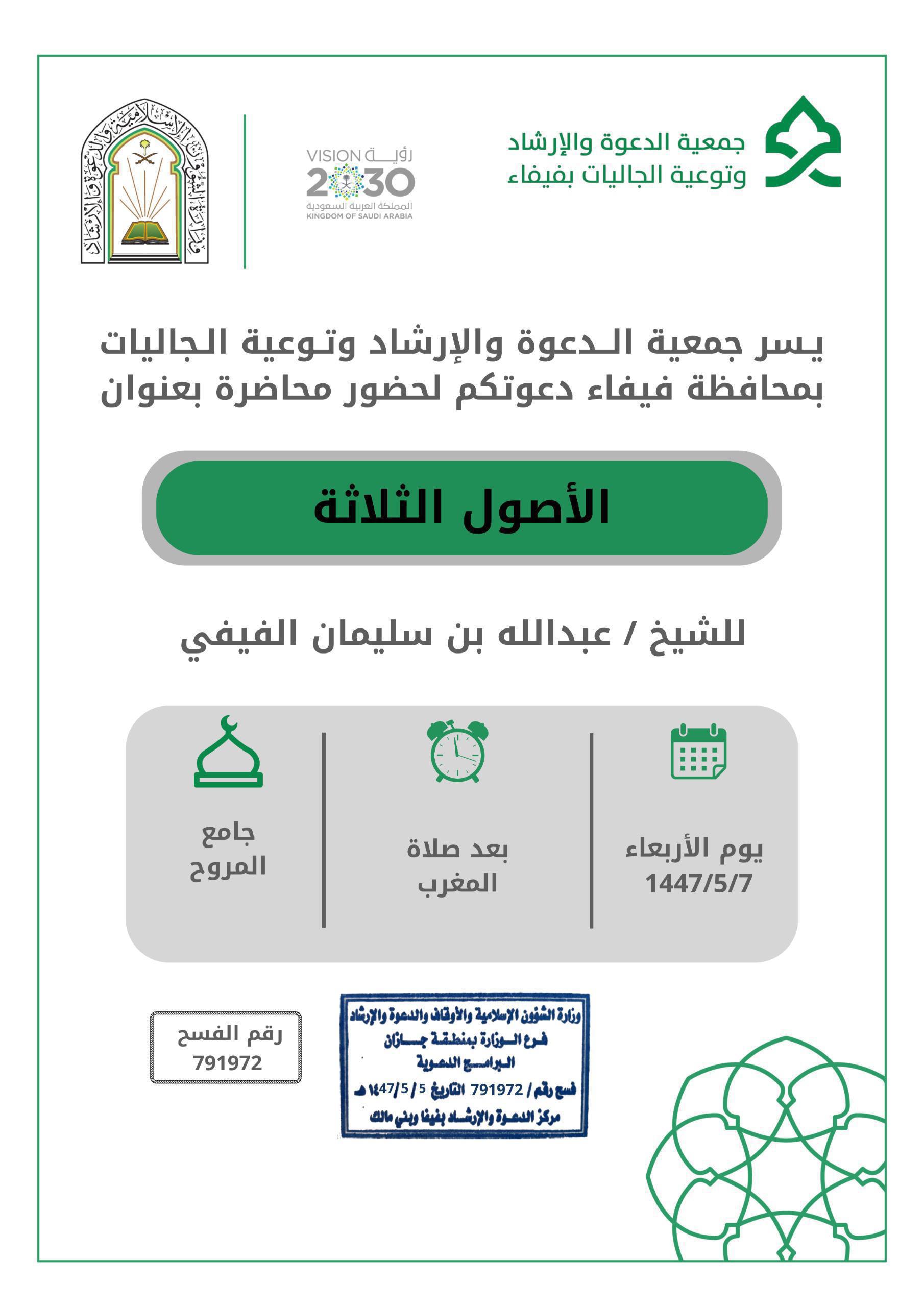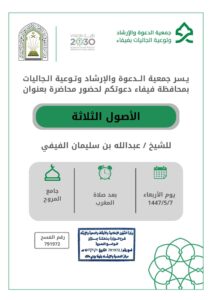 وفي محافظة فيفا، تُقام محاضرةٌ دعوية بعنوان “الأصول الثلاثة ” بجامع المروح بعد صلاة المغرب ، كما تُنفّذ سلسلةٌ من المحاضرات الدعوية النسائية عبر البث المباشر كل يوم خميس ، تتناول موضوعاتٍ متنوعة، من أبرزها: حسن الظن بالله، وفضل العفو والصفح، وشرح حديث (خيركم من طال عمره وحسن عمله).
