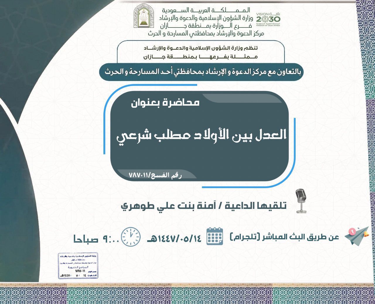 يُنفّذ فرع وزارة الشؤون الإسلامية والدعوة والإرشاد في منطقة جازان، ممثلاً بمركز الدعوة والإرشاد في محافظتي أحد المسارحة والحرث، سلسلة من المناشط الدعوية التي تُقام حضورياً في الجوامع والمساجد والدور النسائية والمصليات، إضافةً إلى بثّها عن بعد عبر الوسائل التقنية، وذلك اعتبارًا من مساء يوم الاثنين الخامس من شهر جمادى الأولى لعام 1447هـ، وتستمر حتى نهاية الشهر الجاري.