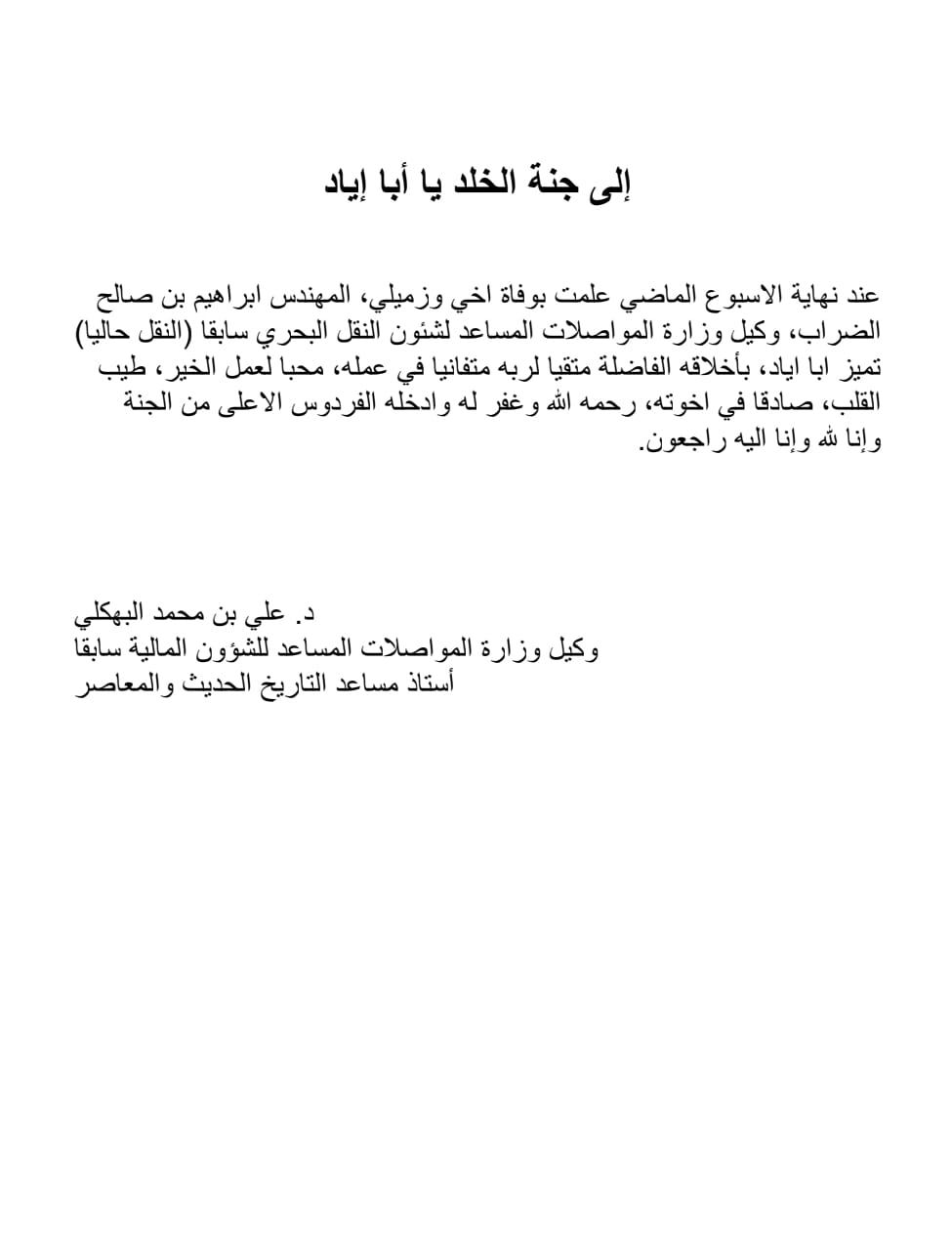 عند نهاية الأسبوع الماضي علمت بوفاة أخي وزميلي، المهندس إبراهيم بن صالح الضراب، وكيل وزارة المواصلات المساعد لشئون النقل البحري سابقا (النقل حاليا) تميز ابا اياد، بأخلاقه الفاضلة متقيا لربه متفانيا في عمله، محبا لعمل الخير، طيب القلب، صادقا في اخوته، رحمه الله وغفر له وادخله الفردوس الاعلى من الجنة وإنا لله وإنا اليه راجعون.