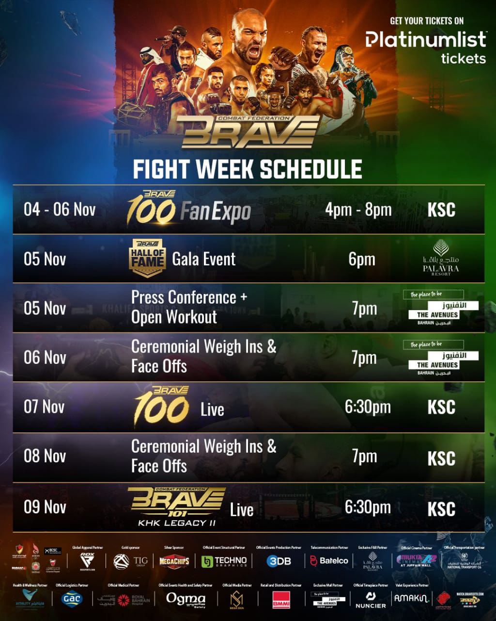 وتستمر الإثارة في 6 نوفمبر مع إقامة فحص الوزن الرسمي ومواجهات المقاتلين (Face Off)، وصولاً إلى ذروة الحدث في 7 نوفمبر بانطلاق بطولة BRAVE 100 التاريخية على صالة مدينة خليفة الرياضية وتُختتم الفعاليات يوم 9 نوفمبر ببطولة BRAVE 101: KHK Legacy II.