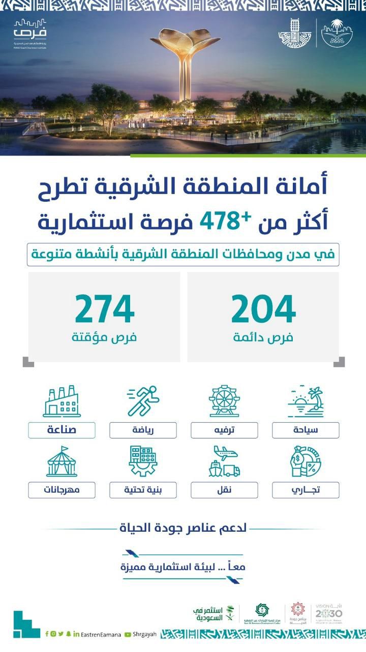 من جهته أوضح المتحدث الرسمي بأمانة المنطقة الشرقية الأستاذ فيصل بن سعيد الزهراني، بأن الفرص المطروحة تشمل 274 فرصة مؤقتة و204 فرص دائمة، تتنوع أنشطتها لتغطي قطاعات عدة من أبرزها السياحة، والترفيه، والرياضة، والصناعة، والتجارة، والنقل، والبنية التحتية، وتنظيم المهرجانات والفعاليات، وذلك بما يلبي احتياجات المدن والمجتمعات المحلية، ويعزز الجاذبية الاستثمارية للمنطقة الشرقية باعتبارها إحدى الوجهات الاقتصادية البارزة في المملكة.