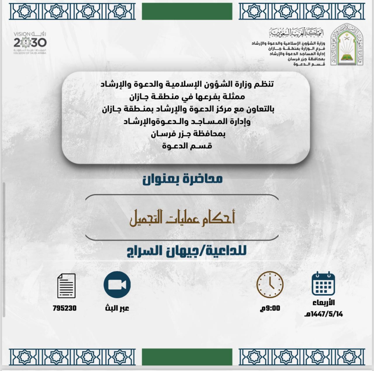 ينظّم فرعُ وزارة الشؤون الإسلامية والدعوة والإرشاد بمنطقة جازان، ممثلاً بمركز الدعوة والإرشاد بالمنطقة، وبإدارة المساجد والدعوة والإرشاد بمحافظة جزر فرسان، عشرَ محاضراتٍ دعويةٍ نسائية، خلال الفترة من 11 إلى 26 جمادى الأولى لعام 1447هـ.