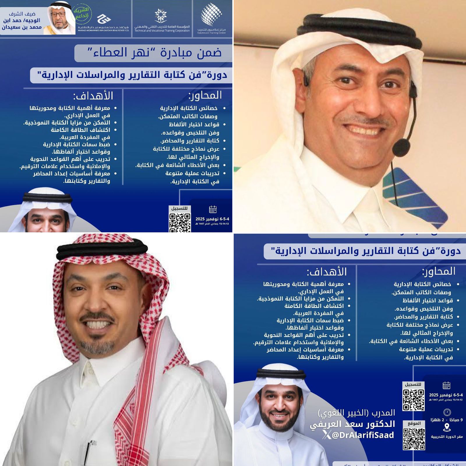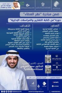 انطلاقًا من الإيمان العميق بأهمية تنمية القدرات البشرية وتحقيقًا لمستهدفات رؤية المملكة 2030 عبر برنامج تنمية القدرات البشرية، ينظم مركز إعلاميون للتدريب بدعم مجتمعي من شركة حمد محمد بن سعيدان العقارية دورة تدريبية نوعية بعنوان: “فن كتابة التقارير والمراسلات الإدارية”، والتي يقدمها الخبير اللغوي الدكتور سعد العريفي، وذلك خلال الفترة من 4 إلى 6 نوفمبر 2025 في مقر المركز في الرياض.