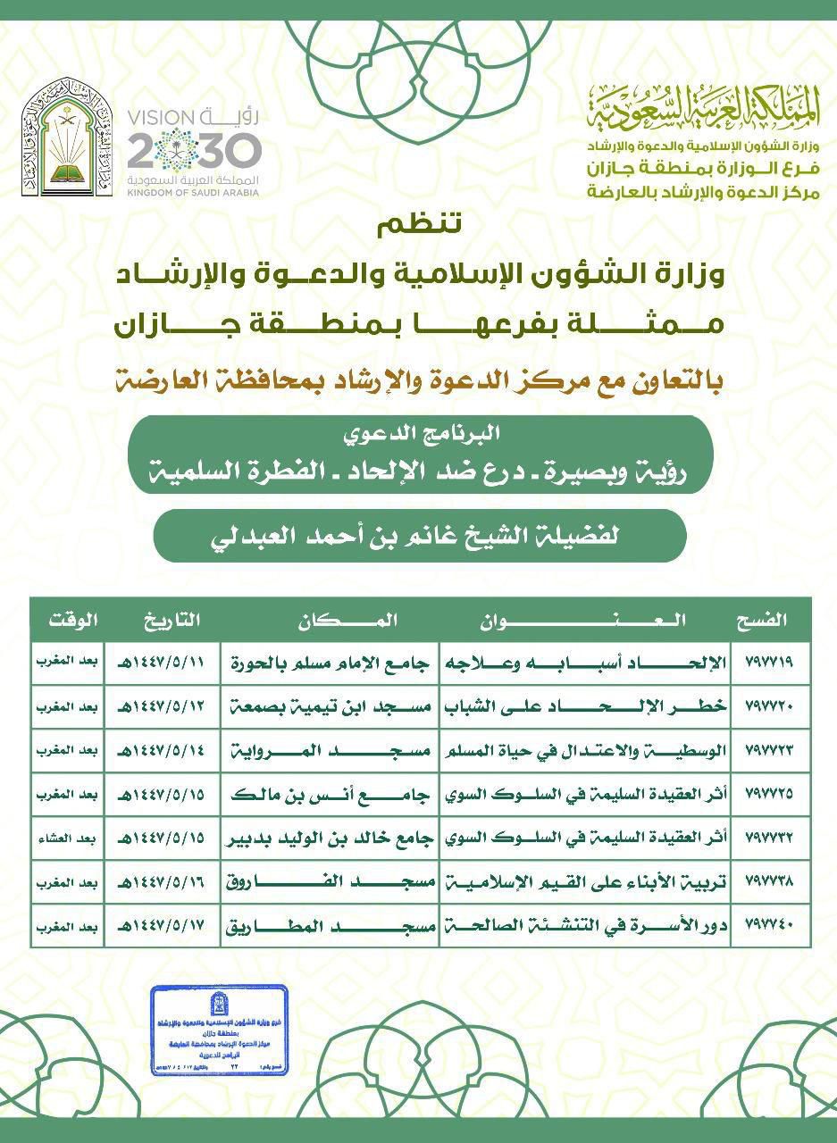 الشؤون الإسلامية في جازان تواصل تنفيذ برنامج “رؤية وبصيرة” الدعوي بمحافظة العارضة