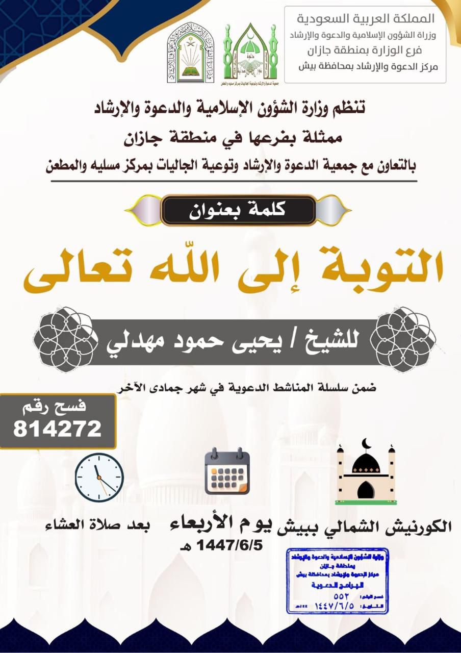 ففي الكورنيش الشمالي ببيش تُقام بعد صلاة العشاء يومَي الأربعاء والجمعة 5 ـ 7 جمادى الآخرة كلمتان دعويتان تتناولان التوبة إلى الله وشرح حديث «من أصبح منكم آمناً في سربه…» وما يتضمنه من معانٍ في استشعار نعم الله وأثرها على حياة المسلم. كما يُقام في مسجد الغاوية بمركز الحقو بعد صلاة المغرب يوم الجمعة درسٌ علمي يشرح كتاب سُلّم الوصول إلى علم الأصول، تأكيدًا على أهمية الأصول الشرعية في بناء الفهم الصحيح للعقيدة والمنهج.