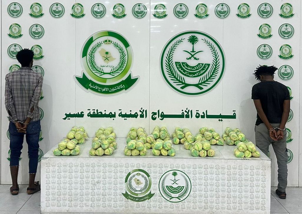 دوريات الأفواج الأمنية بمنطقة عسير تقبض على مخالفَيْن لنظام أمن الحدود لتهريبهما 20 كلجم من القات المخدر