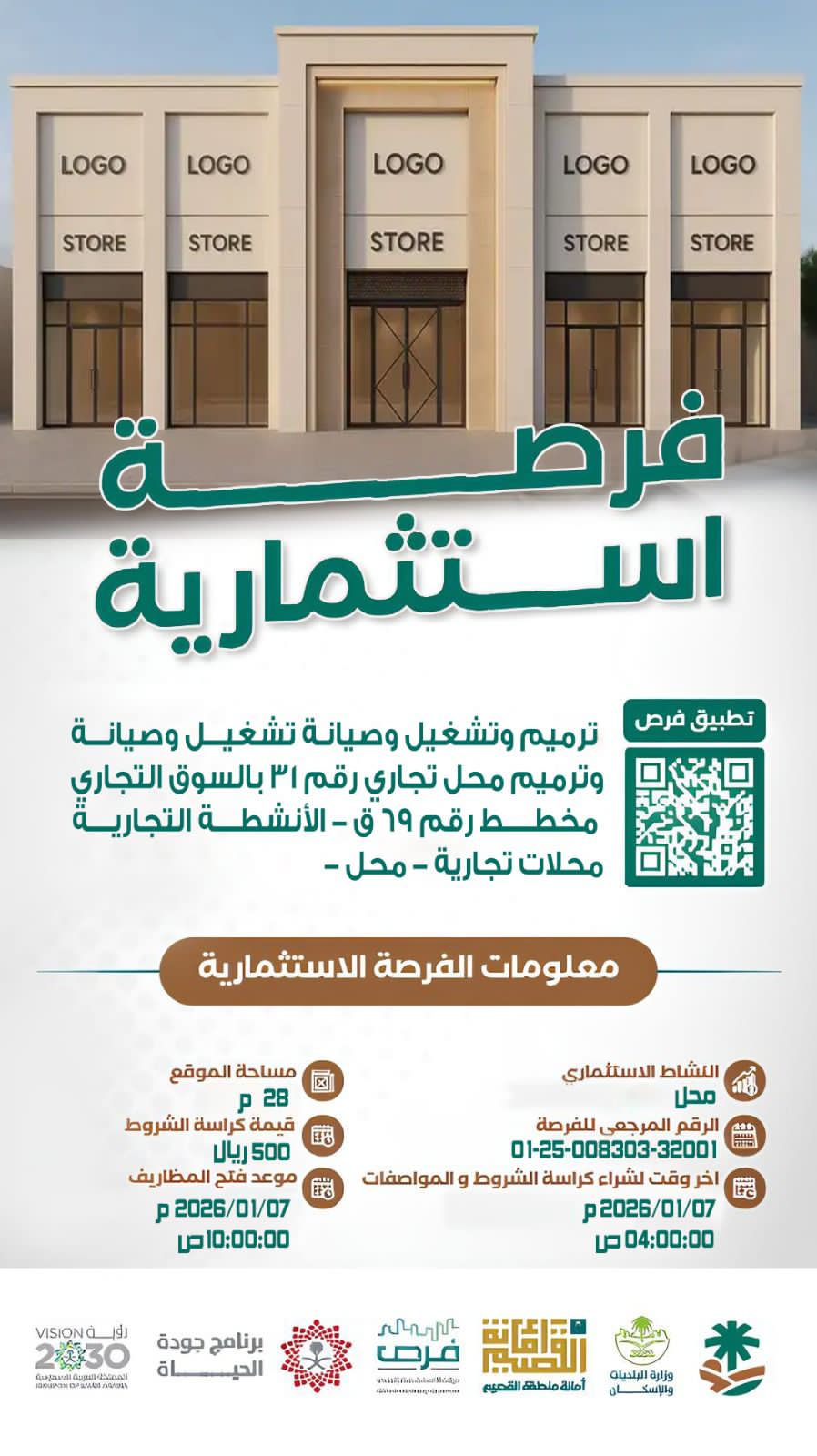 طرحت أمانة منطقة القصيم ممثلة ببلدية محافظة رياض الخبراء فرصة استثمارية تتمثل ” بترميم وتشغيل وصيانة تشغيل وصيانة وترميم محل تجاري رقم ٣ بالسوق التجاري بالمحافظة مخطط رقم 69 ق بأنشطة متنوعة أمام منشآت القطاع الخاص، مما يعزز دور القطاع الخاص، وذلك ضمن برامجها التنموية وتحقيق الاستدامة المالية بما يسهم في رفع جودة الحياة، داعيةً المستثمرين الراغبين في التنافس الاطلاع على الفرصة، وتفاصيل المنافسة من خلال تطبيق الاستثمار البلدي (فرص).