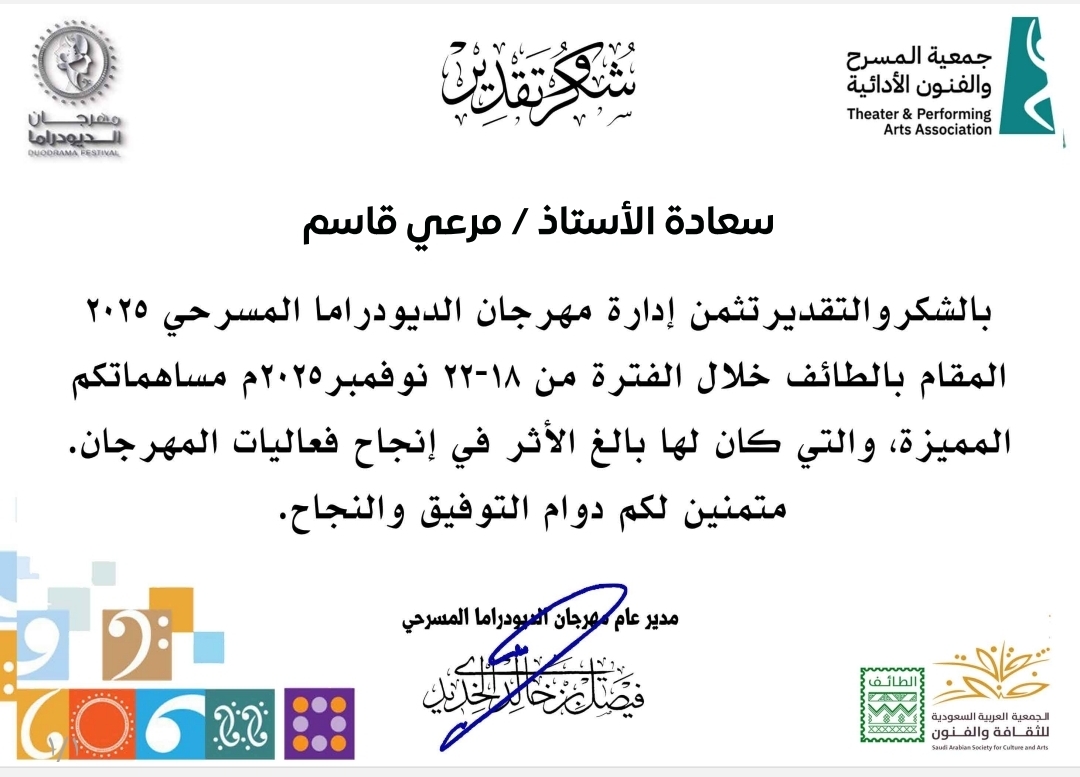 مدير صحيفة واكب مرعي قاسم يشكر ويثمن. لإدارة الديو دراما المسرحي بالطائف شكرهم وتقديرهم